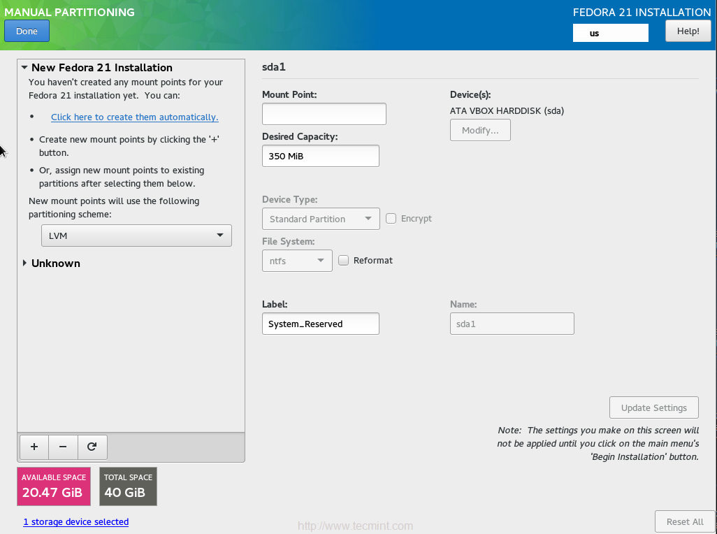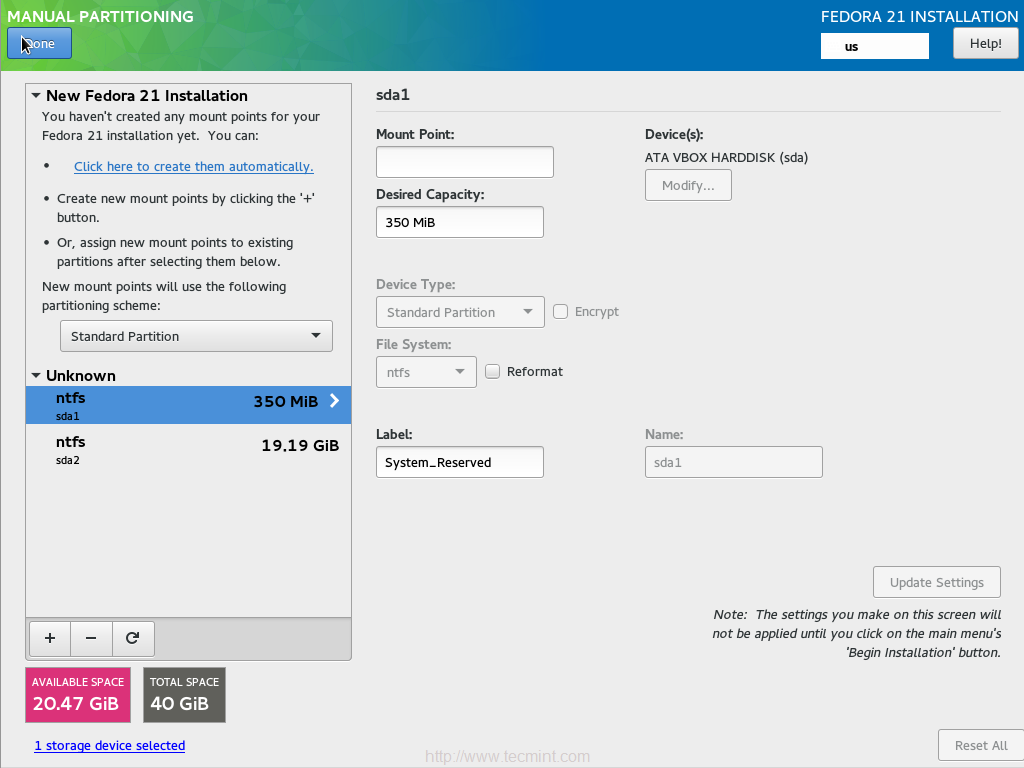 6. At bottom left corner, you can see Available Space with 20.47GB for Fedora 21 installation.