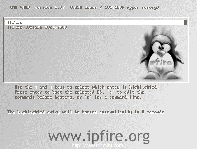 11. After the system reboot, it will prompt you IPFire boot menu option, select the default option by pressing the enter key.