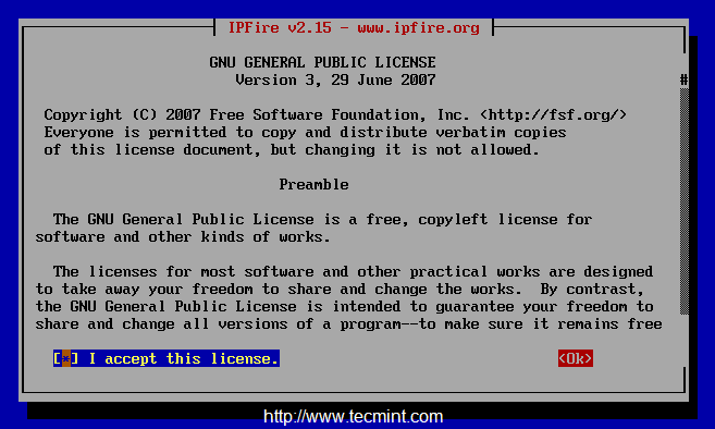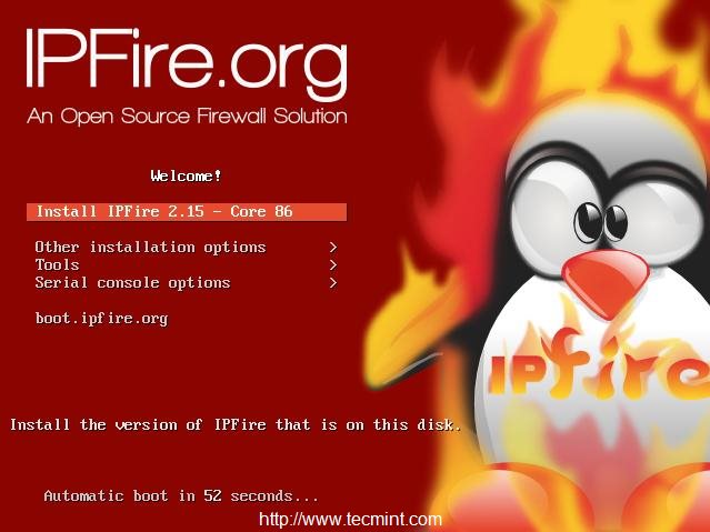 Host name : ipfire.tecmint.com IP address : 192.168.1.1 Hard disk size : 4 GB Ethernet Cards : 2 No's