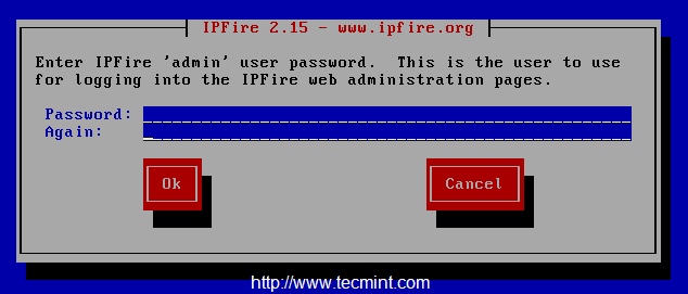 17. Now here we need to provide a password for the admin user for the IPFire GUI web interface. The password must be different from the command line access credentials for security reasons.