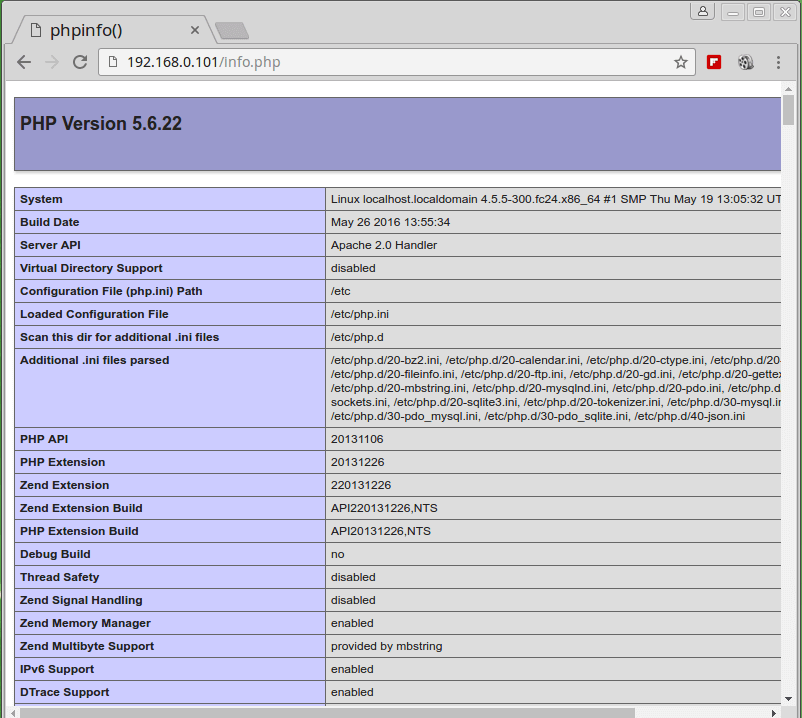 Now you can test it all, using your favorite editor, create a called file info.php in your Apache root directory as follows: