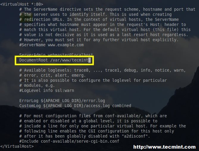 Within this file there is one very important line for getting a website hosted, that line is the ‘DocumentRoot‘ line. This line tells Apache where the necessary web files are that it should serve when requests come in for particular resources.