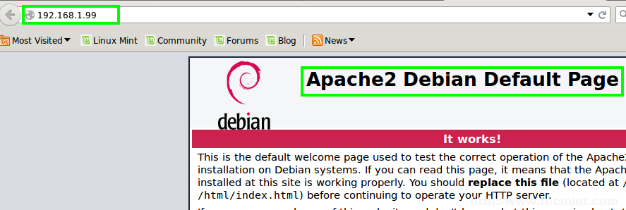 Regardless of which utility is used, the IP address obtained can be entered into a web browser on a computer on the same network to confirm that Apache is displaying the default page.