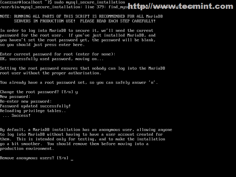 5. The next step is to secure the MySQL database by setting a password for the root account, removing anonymous user accounts, removing the test database, and disallowing remote login for the user root (press [Enter] key for the root account current password and answer with Yes on all security questions).