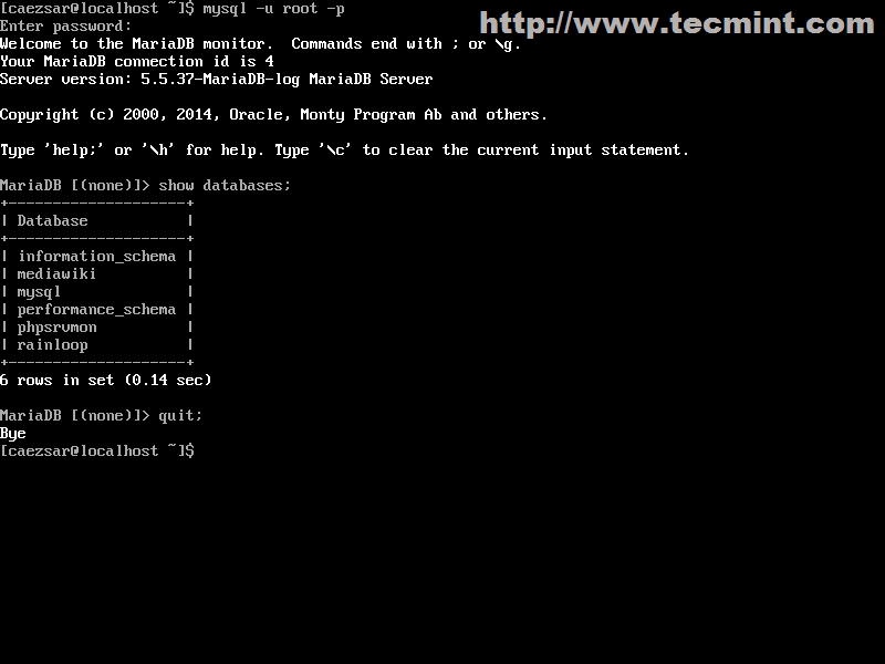 6. Verify MySQL database connectivity by running the following command then leave the database shell with quit or exit statement.