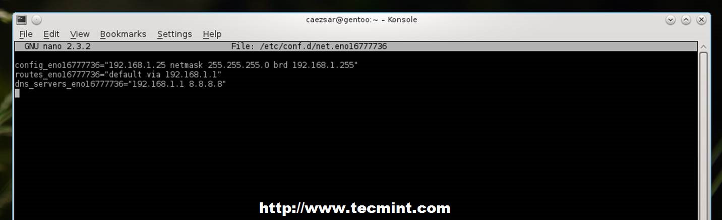 # ln -s /etc/init.d/net.lo /etc/init.d/net.eno16777736 # sudo nano /etc/conf.d/net.eno16777736