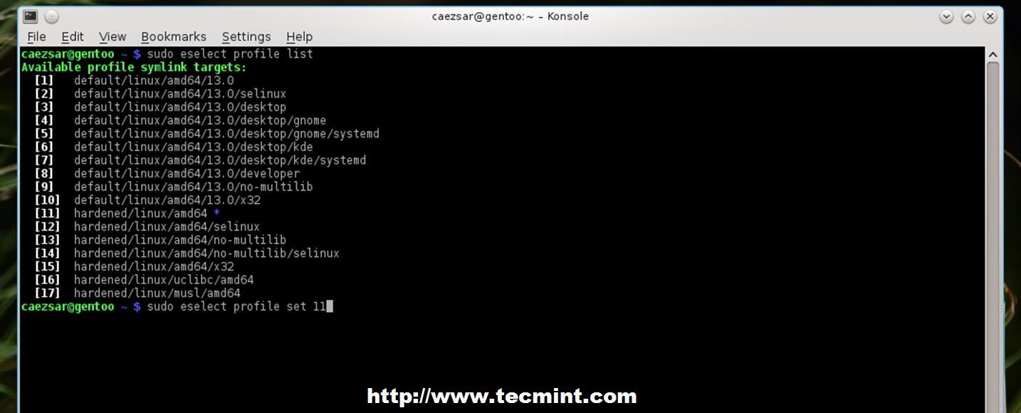 $ sudo eselect profile list $ sudo eselect profile set 11