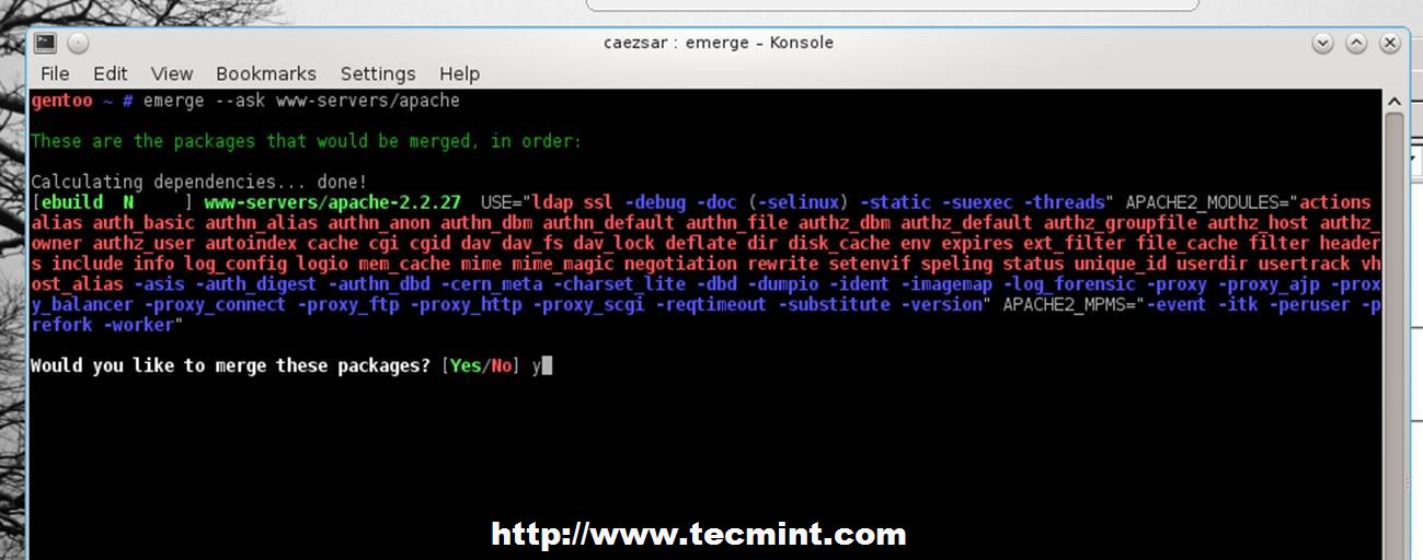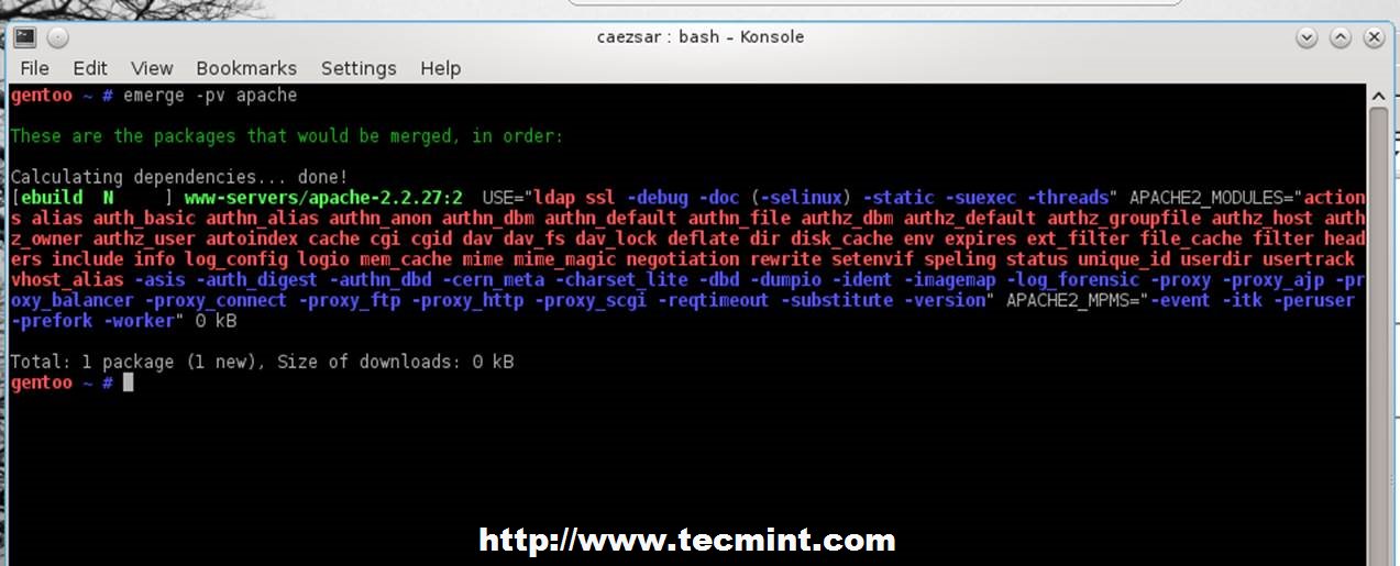 8. Choose your USE flags for compiling process (you can leave it as it is if your server don’t require certain modules), then install Apache using the following command.