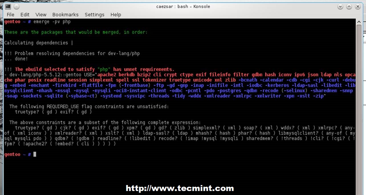 # echo “dev-lang/php apache2 cgi ctype curl curlwrappers -doc exif fastbuild filter ftp hash inifile json mysql mysqli pdo pic posix sockets spell truetype xml zip” >> /etc/portage/package.use