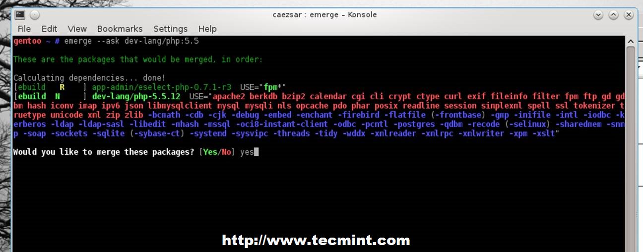 12. After you have selected required USE flags using one of the two presented methods, install PHP with the following command.