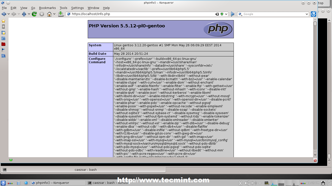 14. To test server configuration so far, create a phpinfo file on localhost root directory (/var/www/localhost/htdocs/) and restart Apache service, then point your browser to http://localhost/info.php or http://system_IP/info.php.