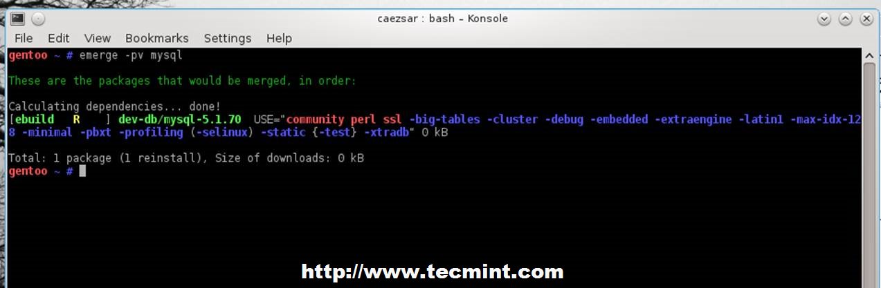 15. Before installing MySQL database verify package USE flags and edit Portage make.conf if required. Use the following commands to verify and install MySQL-server database.