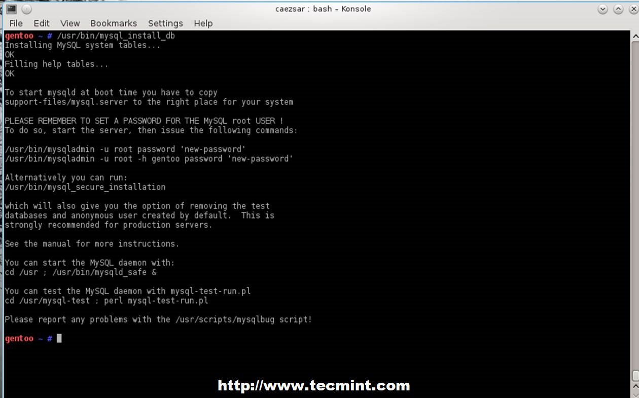 if you get an error that command /usr/bin/mysql_install_db is not found, run /usr/share/mysql/scripts/mysql_install_db –basedir=/usr , followed by /etc/init.d/mysql start and /usr/bin/mysql_secure_installation (http://forums.gentoo.org/viewtopic-t-956346-start-0.html)