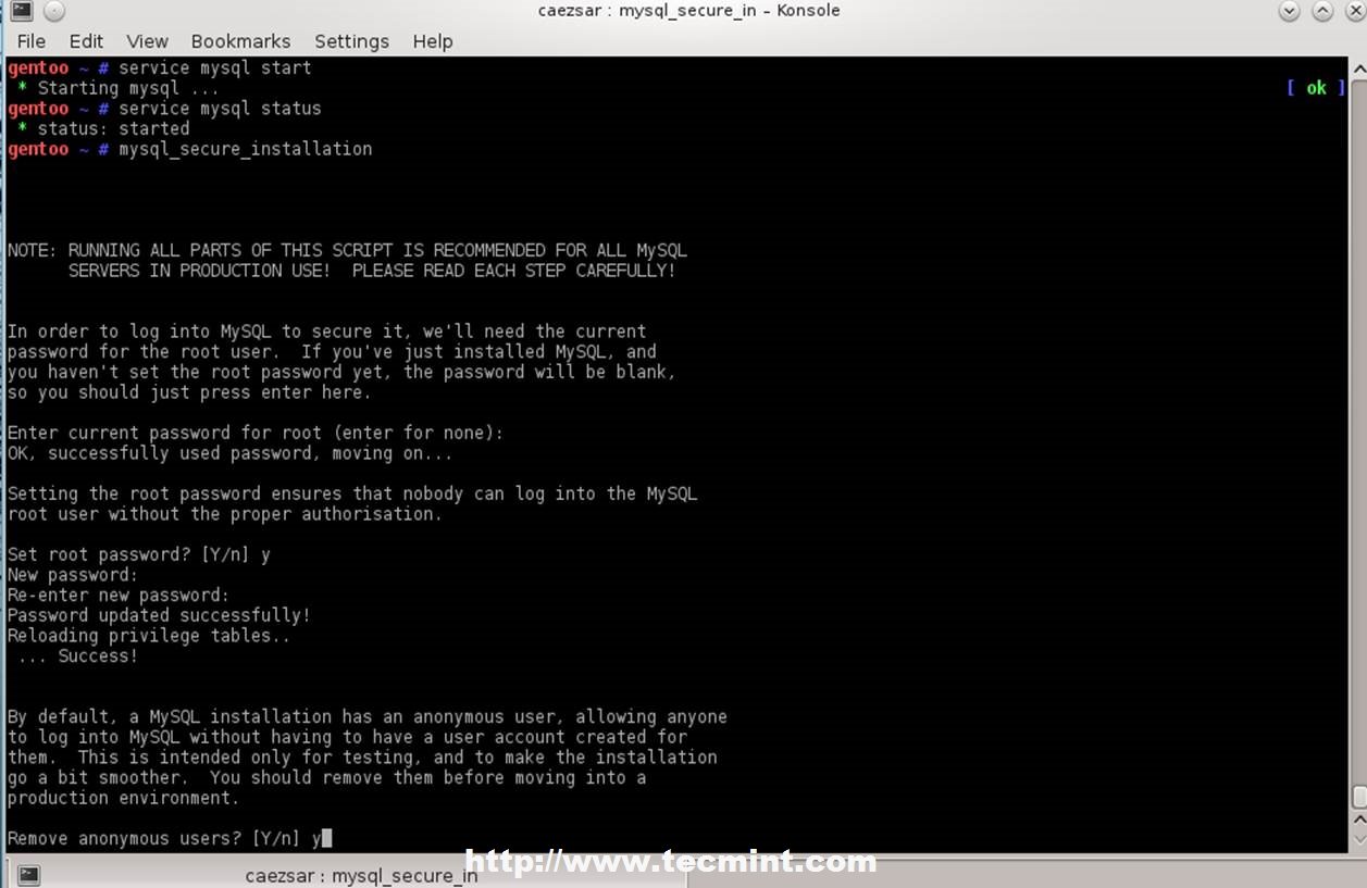 17. Now start MySQL database and secure it using mysql_secure_installation by changing root password, disable root login outside localhost, remove anonymous user and test database.