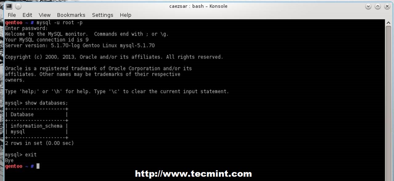 18. To test database functionality login to MySQL issuing the command below and exit database with quit statement.