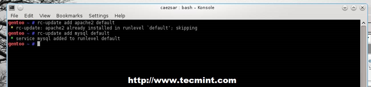 # rc-update -v add apache2 default # rc-update -v add mysql default