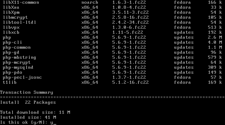 The installation of PHP and its modules in Fedora 22 is simple and can be completed with these commands: