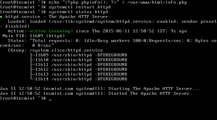 10. Once the install is complete you can test PHP by creating a simple PHP file info.php under Apache root directory i.e. /var/www/html/ and then restart Apache service to verify the PHP info by navigating your browser to the address http://server_IP/info.php.