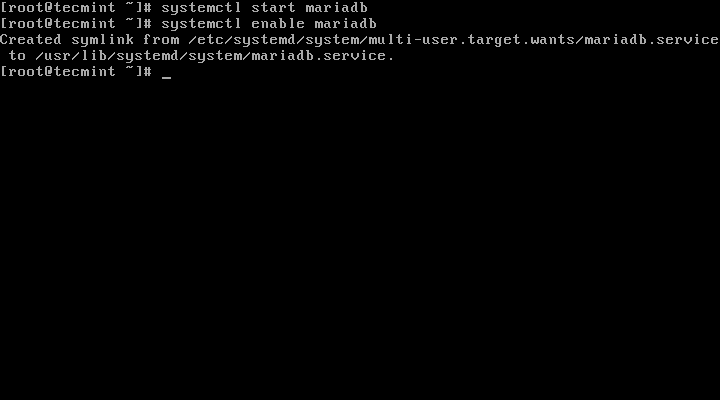 7. Once mariadb installation complete, you can start and enable MariaDB to auto start at system boot by issuing the following commands: