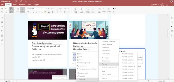 The platform is equipped with ONLYOFFICE Docs, an online office suite, that provides a complete set of formatting and editing tools for different content, including e-books and PDF files.
