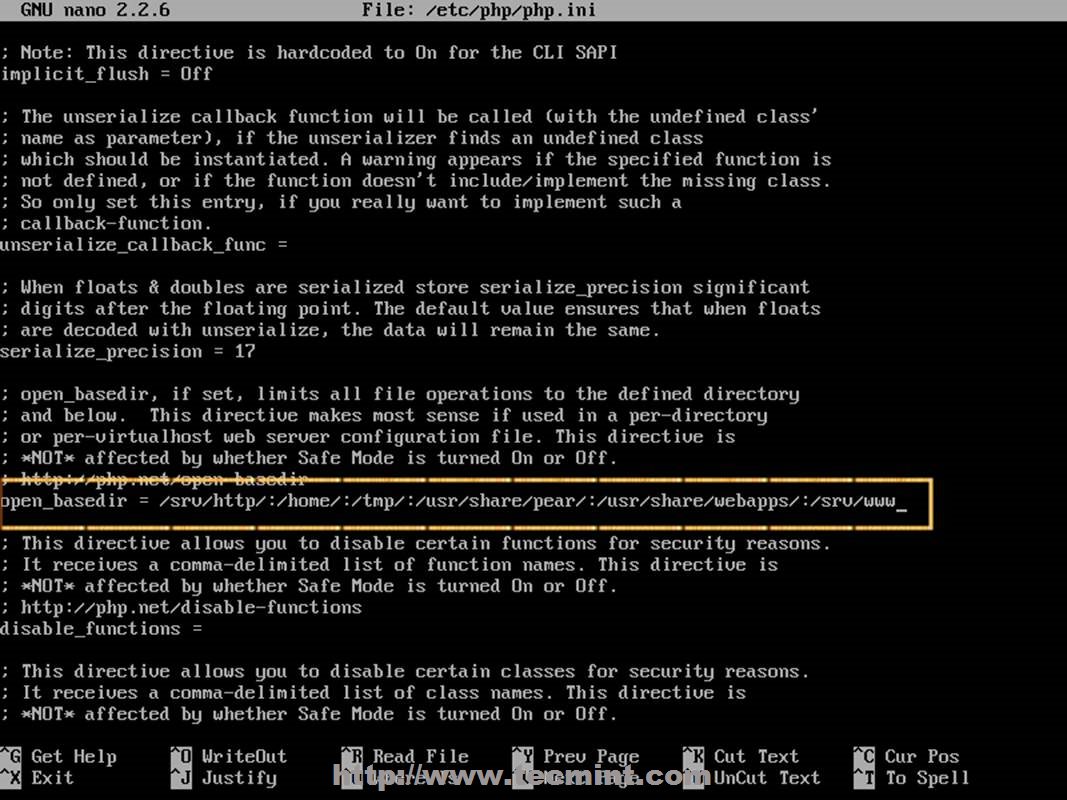 If Nginx/Apache Document Root path has been changed ( default one is /srv/http/) use [Ctrl+w] to locate open_basedir statement and append the new path by prefixing with a colon “ : “ – in this case the new path is /srv/www/ – to look like in the example below.