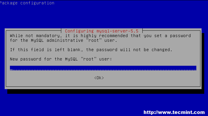 Depending on the system hardware and the Internet connection, this process could take some time. As of this writing, a fresh Debian Jessie install with all updates applied required about 70MB of archives from the repositories (not all that bad considering what the server will be doing when things are done)! During the installation process, the system may prompt for the user to set a SQL root user password. This is different than the actual root user’s password and for security’s sake, should probably remain different.