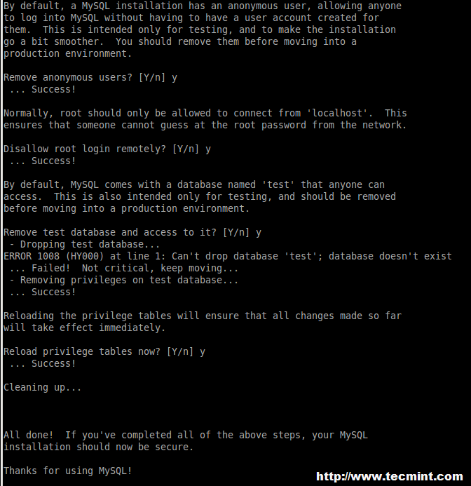 3. After MySQL installation, it is often recommended that the SQL server have some basic house keeping done on the default install. This is easily accomplished with the mysql_secure_installation utility.