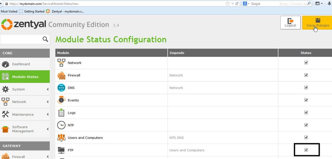 3. After the package installation finishes open a browser and connect to Zentyal Web Admin Tool ( https://zentyal_IP ). Go to Module Status, check FTP module, hit Save Changes and Save.