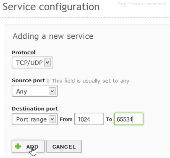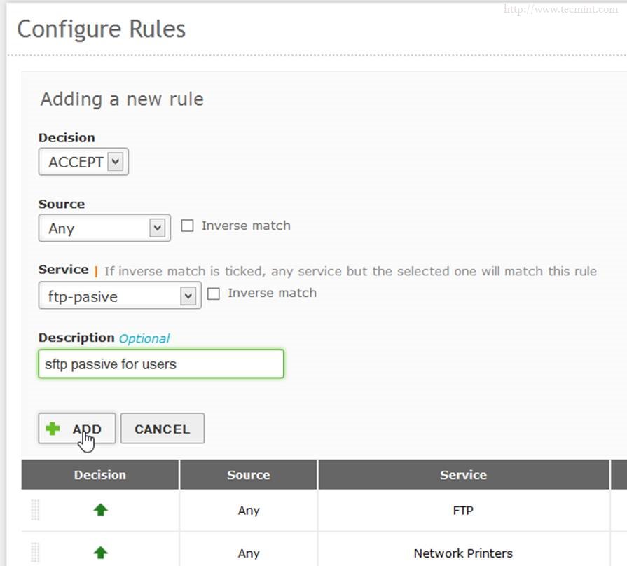 12. On the new prompt enter “ftp-passive” string on in Service Name field, a service Description and click on ADD button.