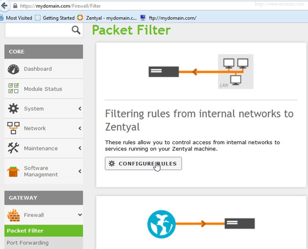 15. To open firewall for this port range service navigate to Firewall module – > Packet Filter -> Configure Rules on Internal Networks to Zentyal (Local Inbound).