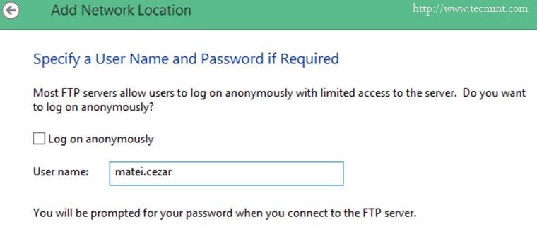 19. Enter a username and a name for this network location hit Finish and your ftp share will appear under Computer drives.