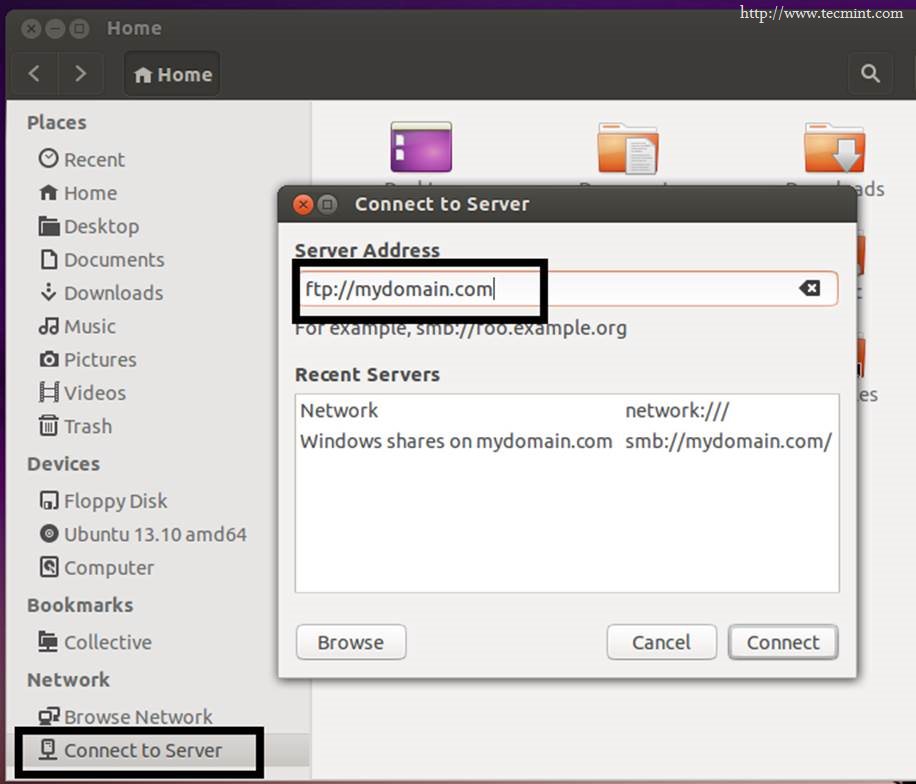 22. Open Nautilus file manager, hit Connect to Server ,enter Server Address ,supply your credentials and bookmark your mounted ftp share.