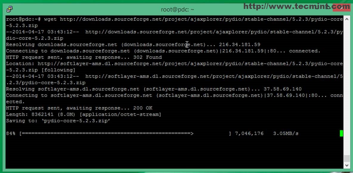 # wget http://downloads.sourceforge.net/project/ajaxplorer/pydio/stable-channel/5.2.3/pydio-core-5.2.3.tar.gz