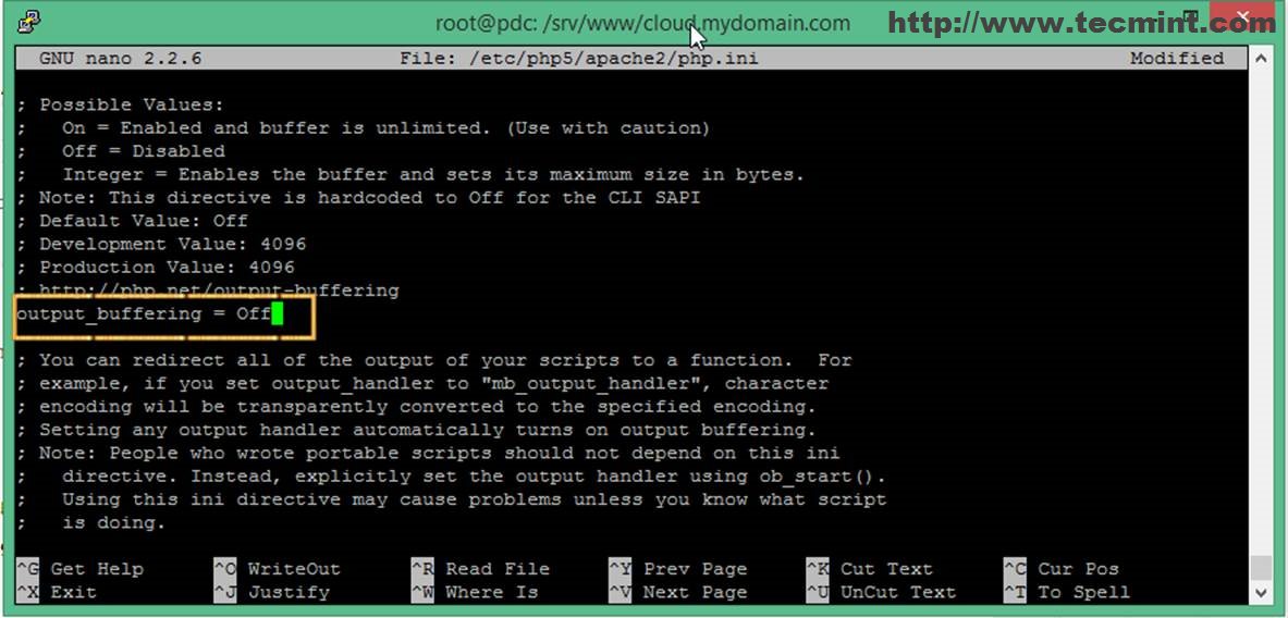 To disable PHP Output Buffer (for better performance) open and change output_buffering value to Off on /etc/php5/apache2/php.ini path.