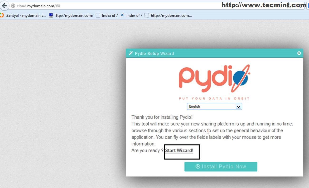 10. Now is time to actually run Pydio installer. After restarting zentyal webserver module again refresh your subdomain page and click on Start Wizard!.