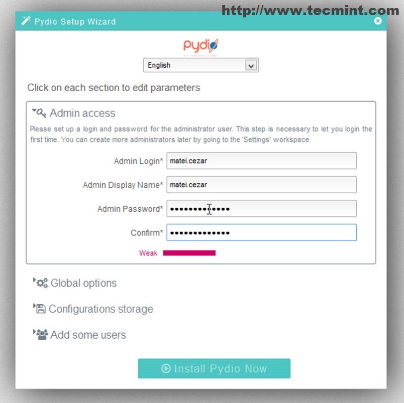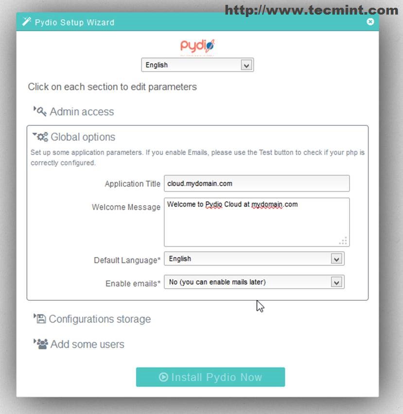 12. Next configure Pydio Global Options by adding a Title, choose your default application language and setup a welcome message (don’t enable email).