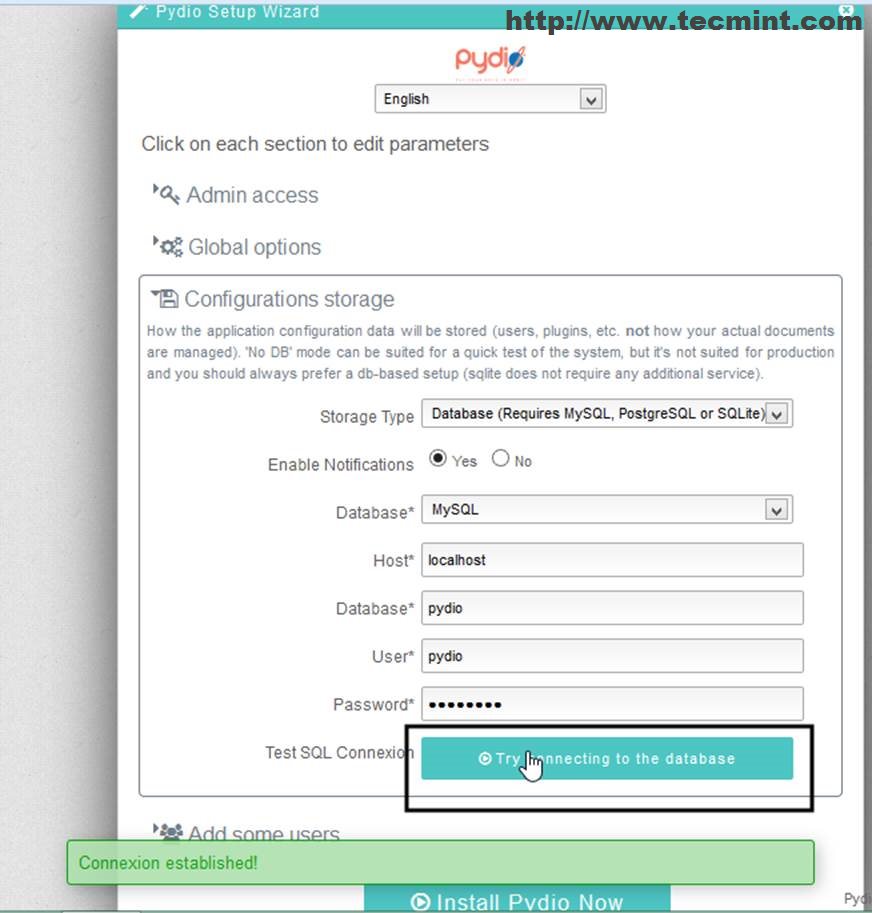 13. On the next prompt connect Pydio to MYSQL database using the credentials created earlier and test your SQL connectivity.