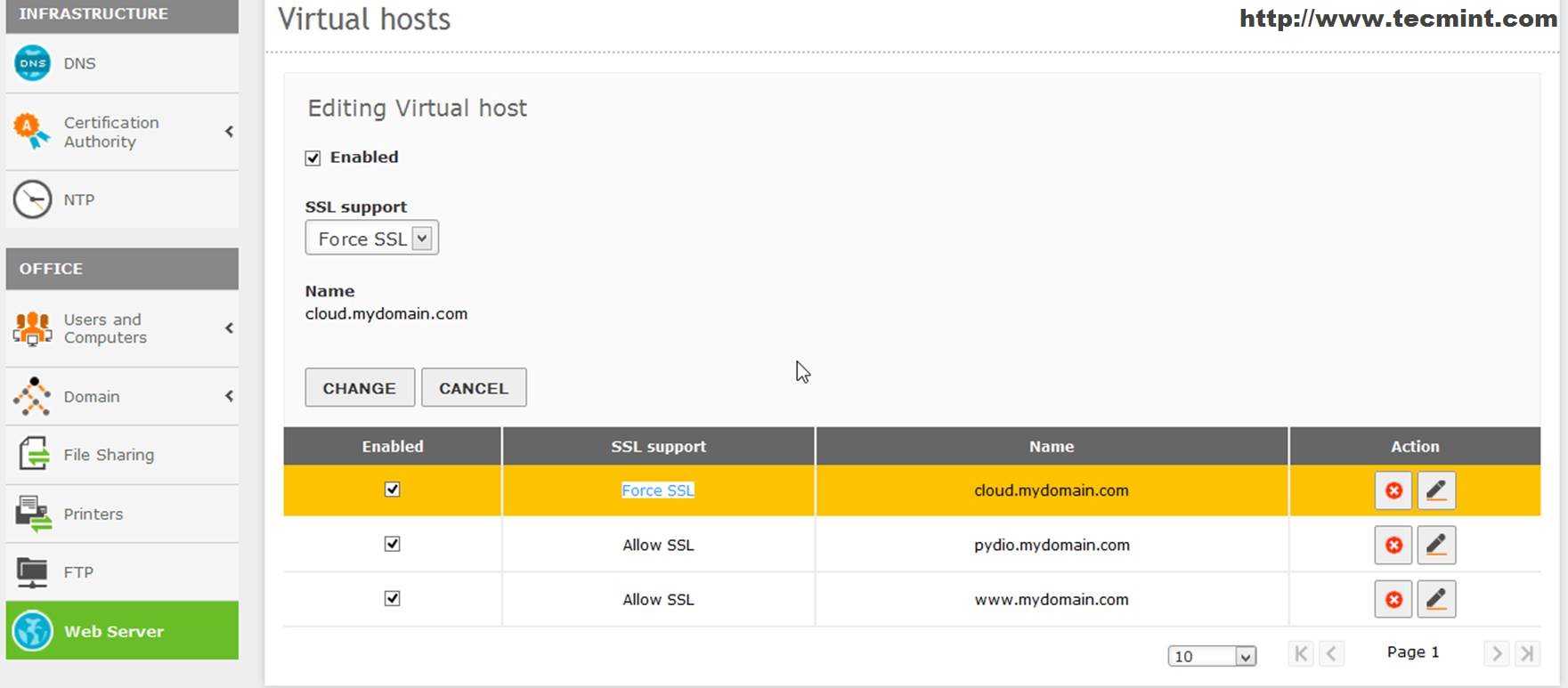17. Login to Zentyal Admin Panel, navigate to Web Server, select your pydio subdomain, click on Edit button form Action, select Force SSL on SSL support, hit on Change and Save your settings.