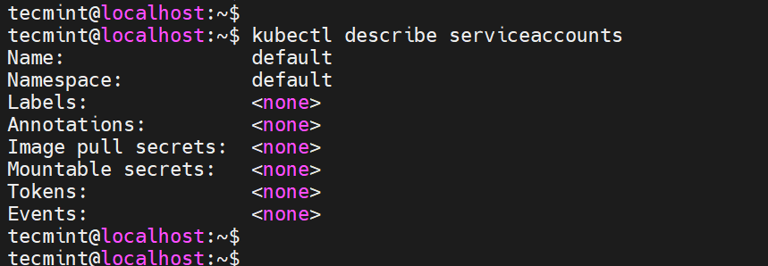 $ kubectl describe serviceaccounts
