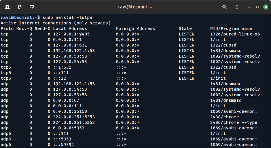 -t: Displays TCP sockets.-u: Displays UDP sockets.-l: Shows only listening ports (no established connections).-p: Shows the process ID (PID) and the name of the program using the socket.-n: Outputs numerical addresses and ports (instead of resolving them to service names like “http“).