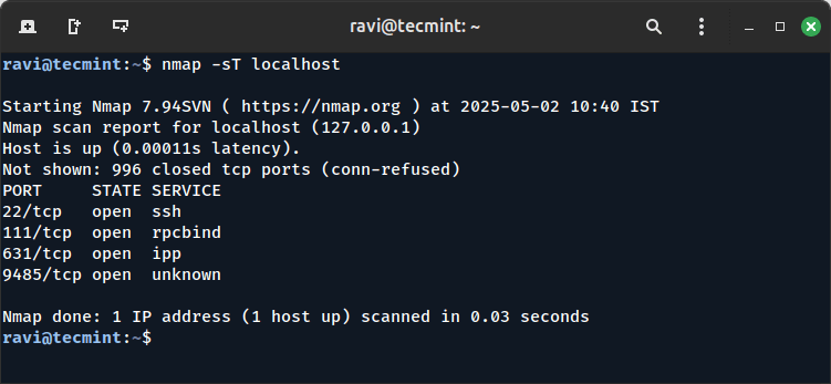 -sT: It tries to make a full connection to each port and checks which ones respond.localhost: Refers to the local machine you want to scan. You can replace localhost with any IP address to scan remote systems.