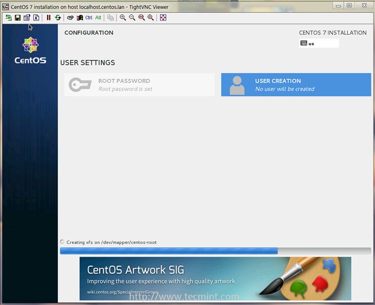 7. After the kernel and ramdisk loads and detects the Kickstart file, the installation process automatically starts without any intervention from user side needed. If you want to watch the installation process connect with a VNC client from a different computer using the address that the installer provides you and enjoy the view.