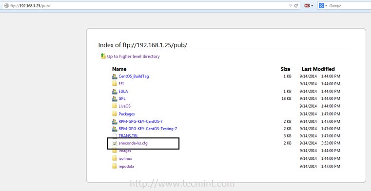 On Centos7 I was unable to see my anaconda-ks.cfg file in the pub directory via browsing FTP. I could see it in the directory with ls however.