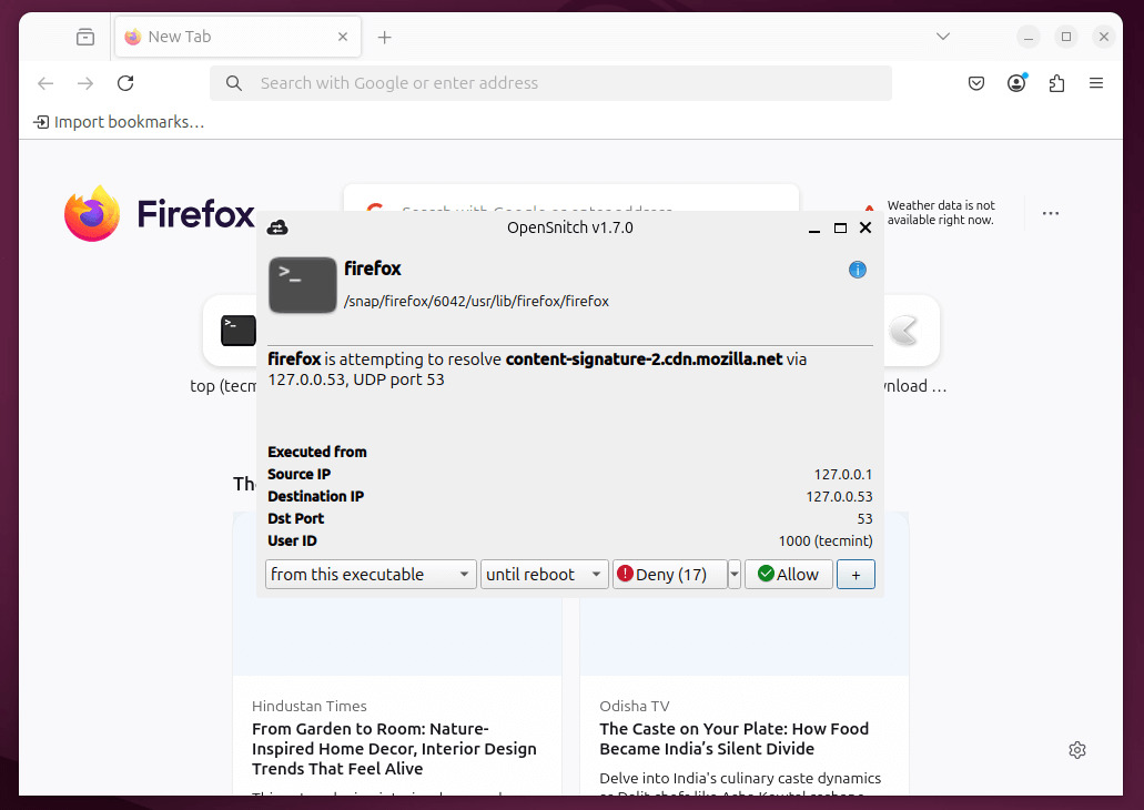 Once installed and running, OpenSnitch monitors every outgoing connection made by your applications. The first time a new app tries to access the internet, OpenSnitch will prompt you with a pop-up asking what to do.