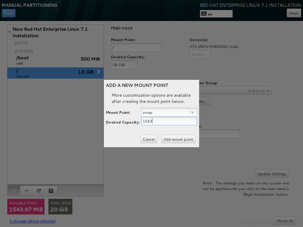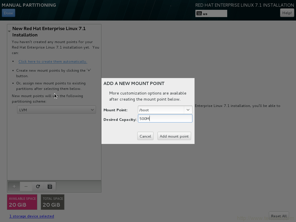 14. Add a new mount point (/boot) by clicking on + symbol. Input desired capacity and click to Add mount point.