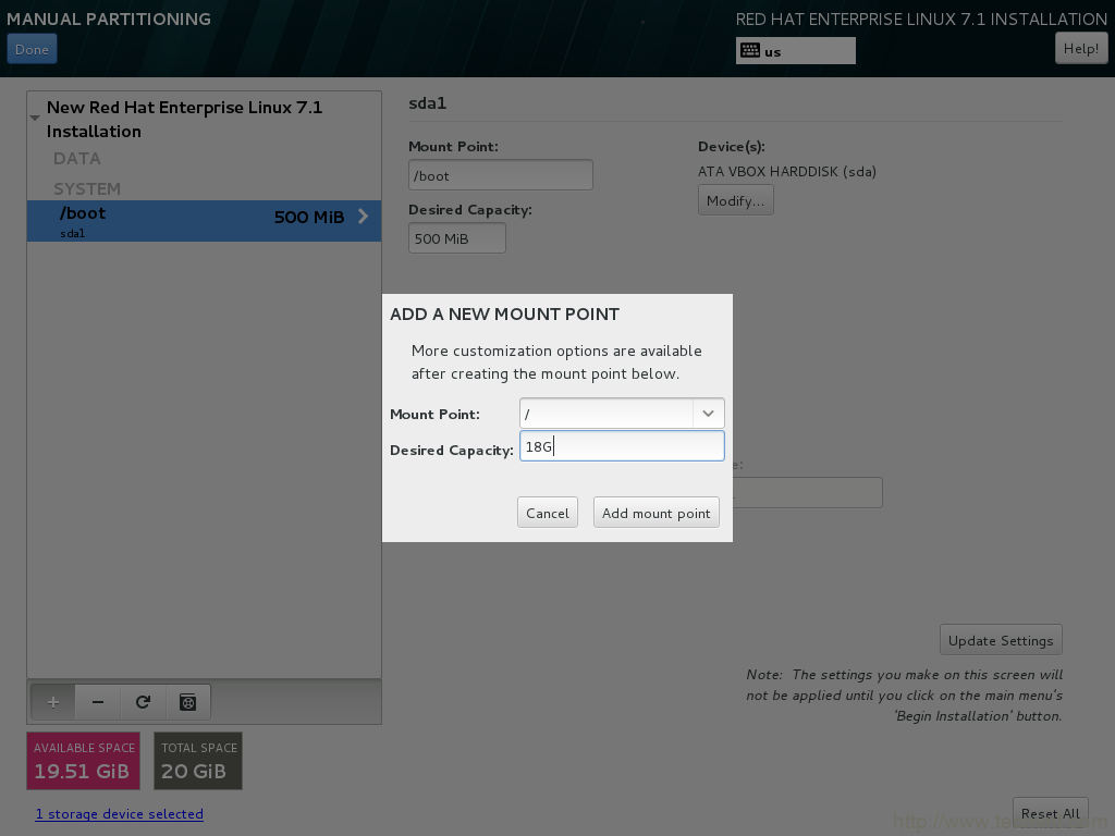 16. Add another mount point (/) by clicking + symbol and add Desired Capacity to it. Finally Click Add mount Point.