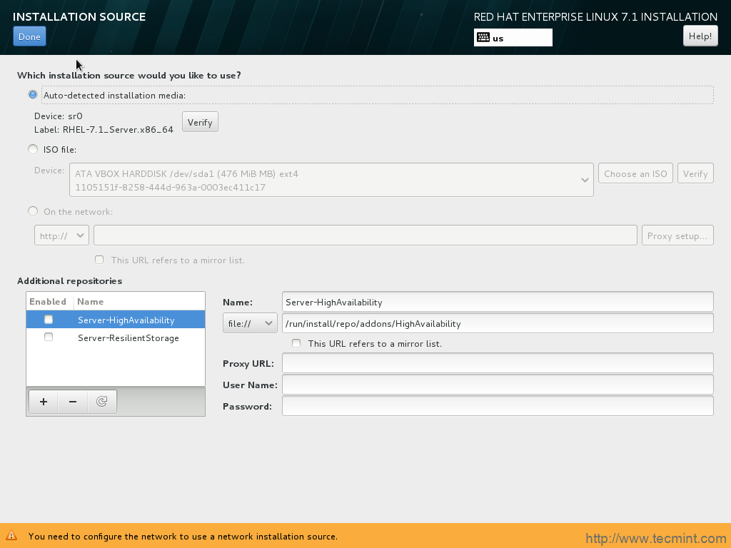 9. Time to modify (not necessary) installation source. Add additional repositories here, and other repositories over http. If you are not sure about these better stick to ‘Auto-detected installation Media‘ and Click Done.