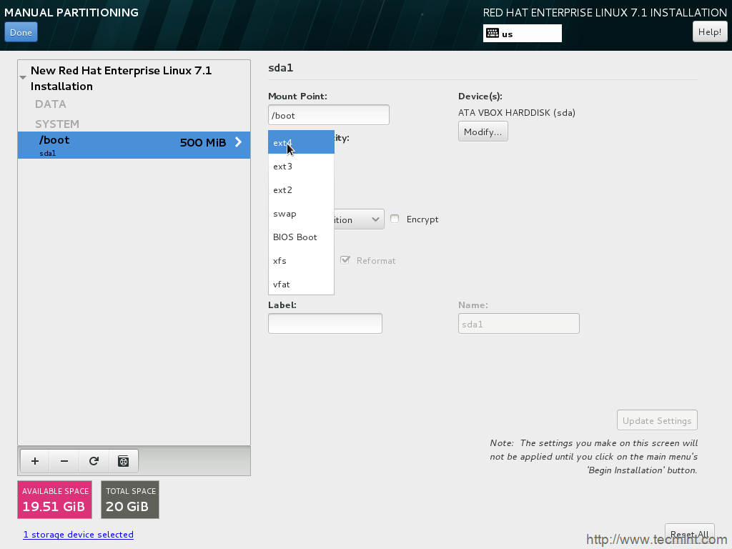 15. Next is the /boot partition settings window. Change file system from xfs to ext4.
