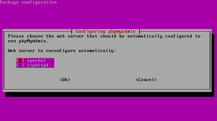 16. On the next step you will be asked to choose server that should be configured to run phpMyAdmin. Nginx is not part of the listed web servers so simply press TAB and proceed: