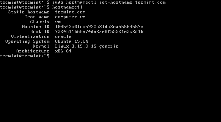 $ sudo hostnamectl set-hostname your-hostname.com $ hostnamectl